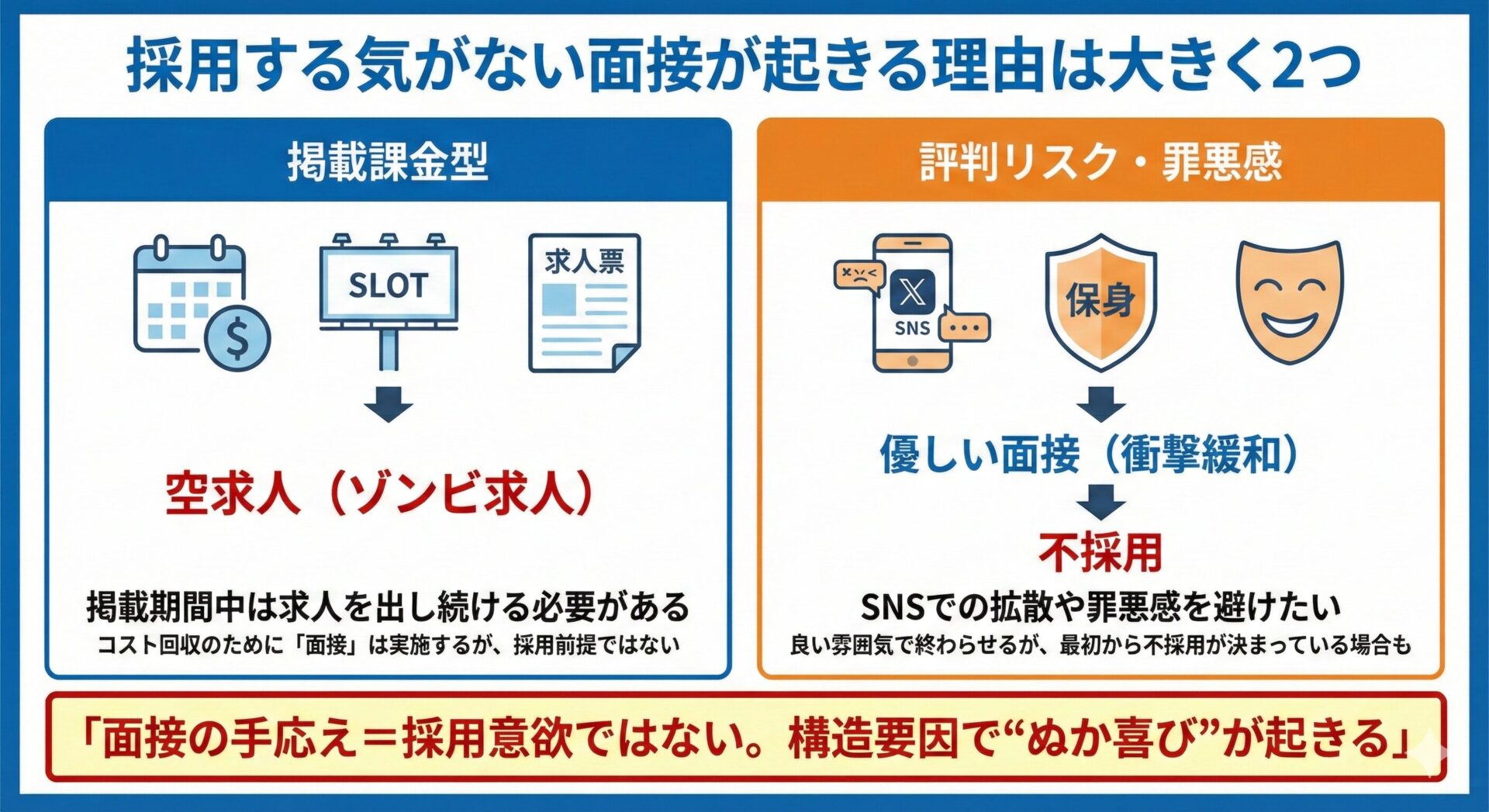 更に目の前の若者を不採用にするという心理的負担(罪悪感)を和らげる為に、無意識に過剰に優しく振る舞う「衝撃緩和」と呼ばれる行動をとる事があります。つまり面接での「手応え」や「優しさ」は採用意欲の証明ではなく、むしろ「不採用のサイン」である場合すらあるのです。